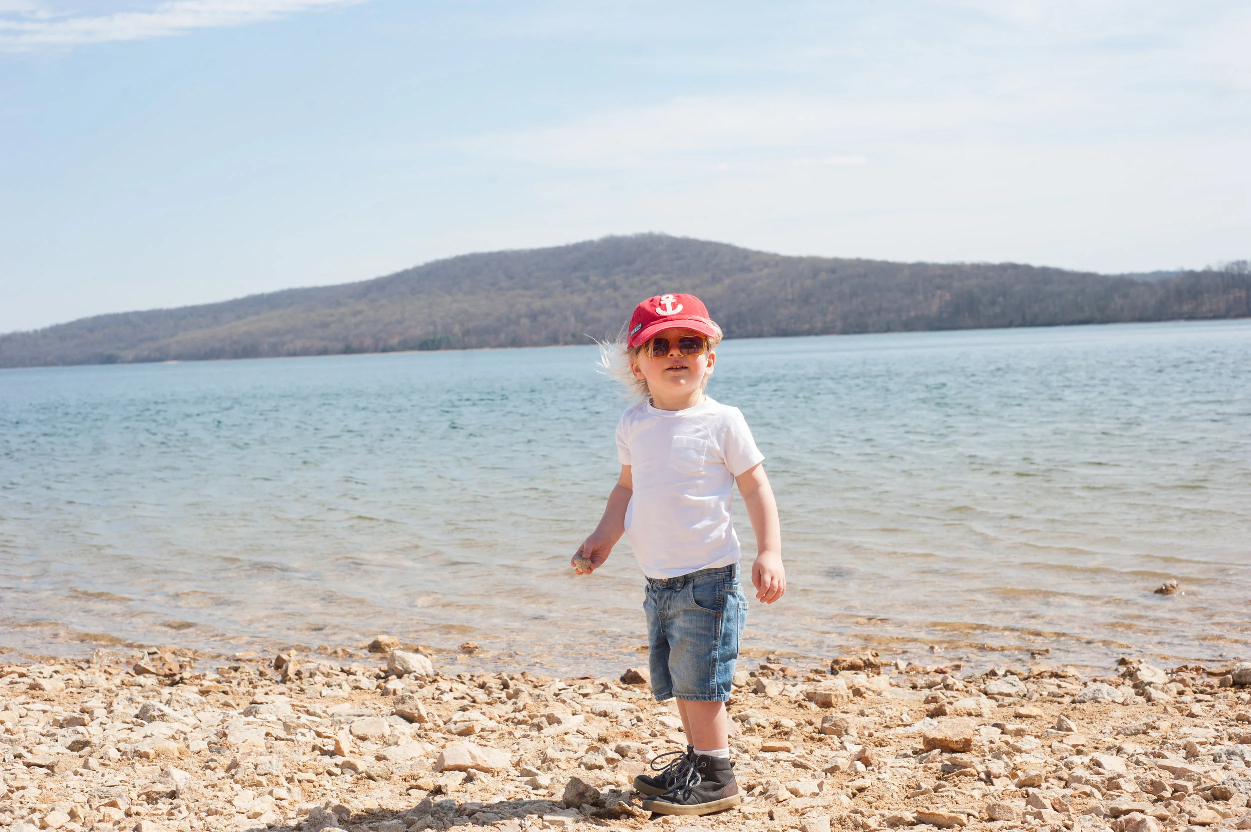 But the water. Oh, the water. Oh, how you are your momma’s boy. “Can we go walk by the ocean?” You wonder at first simply in wonder, and then in definite inquiry, upon hearing Denise say that we might. “Of course.” We swing you down so you can climb over beds of stone, and you and I find a nice, plump rock, where we sit and take a drink. Further down the shore, Daddy picks up a pebble, a flat one, and skips it—flick, one, two, three, sink. And you follow suit, making pebble after pebble go ‘plash in the reservoir. Toss, plop. Toss, plop.